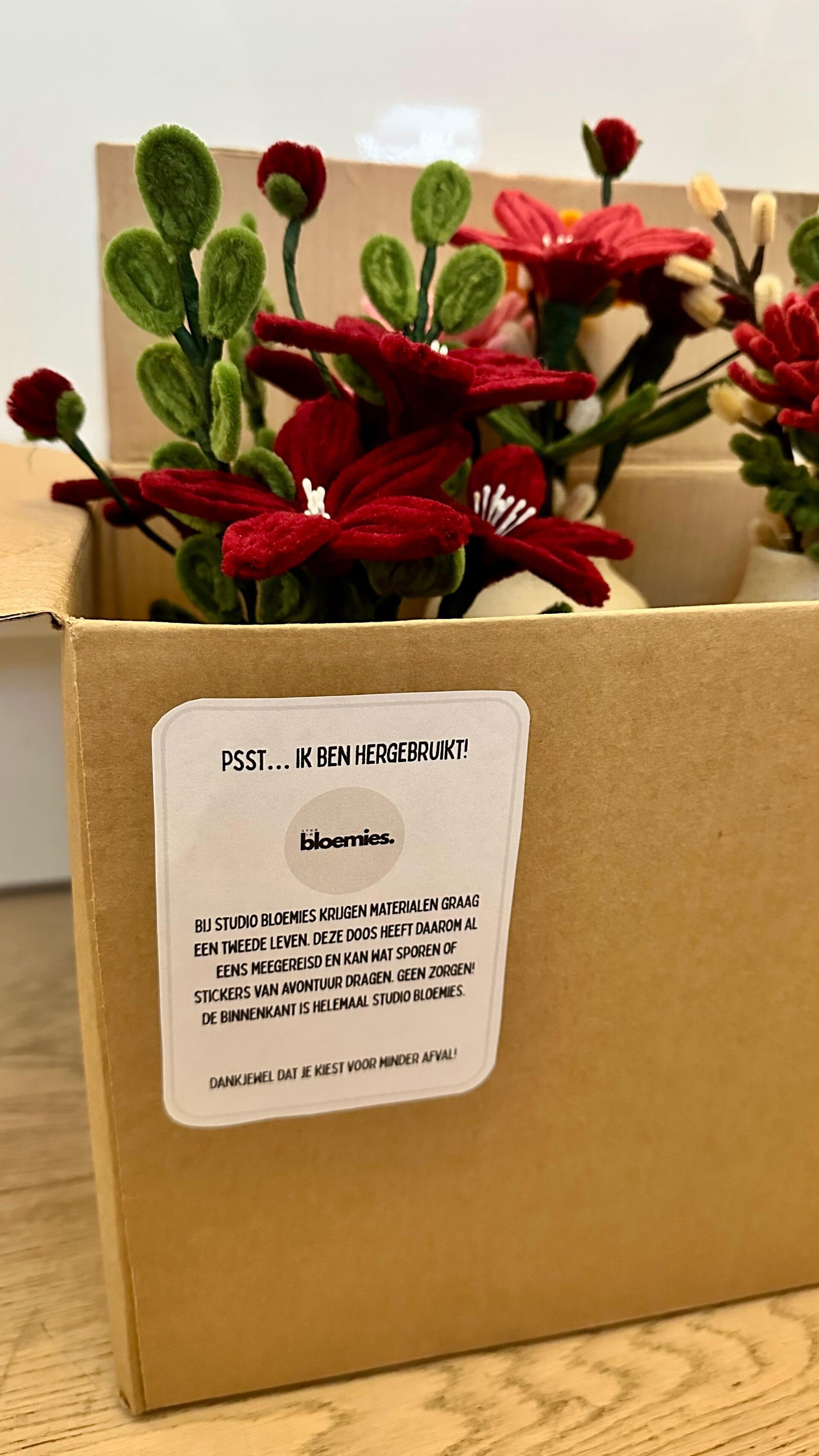 Bij Studio Bloemies krijgt een verzenddoos graag een tweede leven. Daarom worden verzenddozen zo veel mogelijk hergebruikt. Het kan dus voorkomen dat je bestelling aankomt in een doos van een ander merk. De inhoud is natuurlijk altijd zorgvuldig verpakt en helemaal van Studio Bloemies. Door dozen opnieuw te gebruiken, wordt onnodig afval verminderd en gaat er minder materiaal verloren. Een kleine stap, maar wél een duurzame.