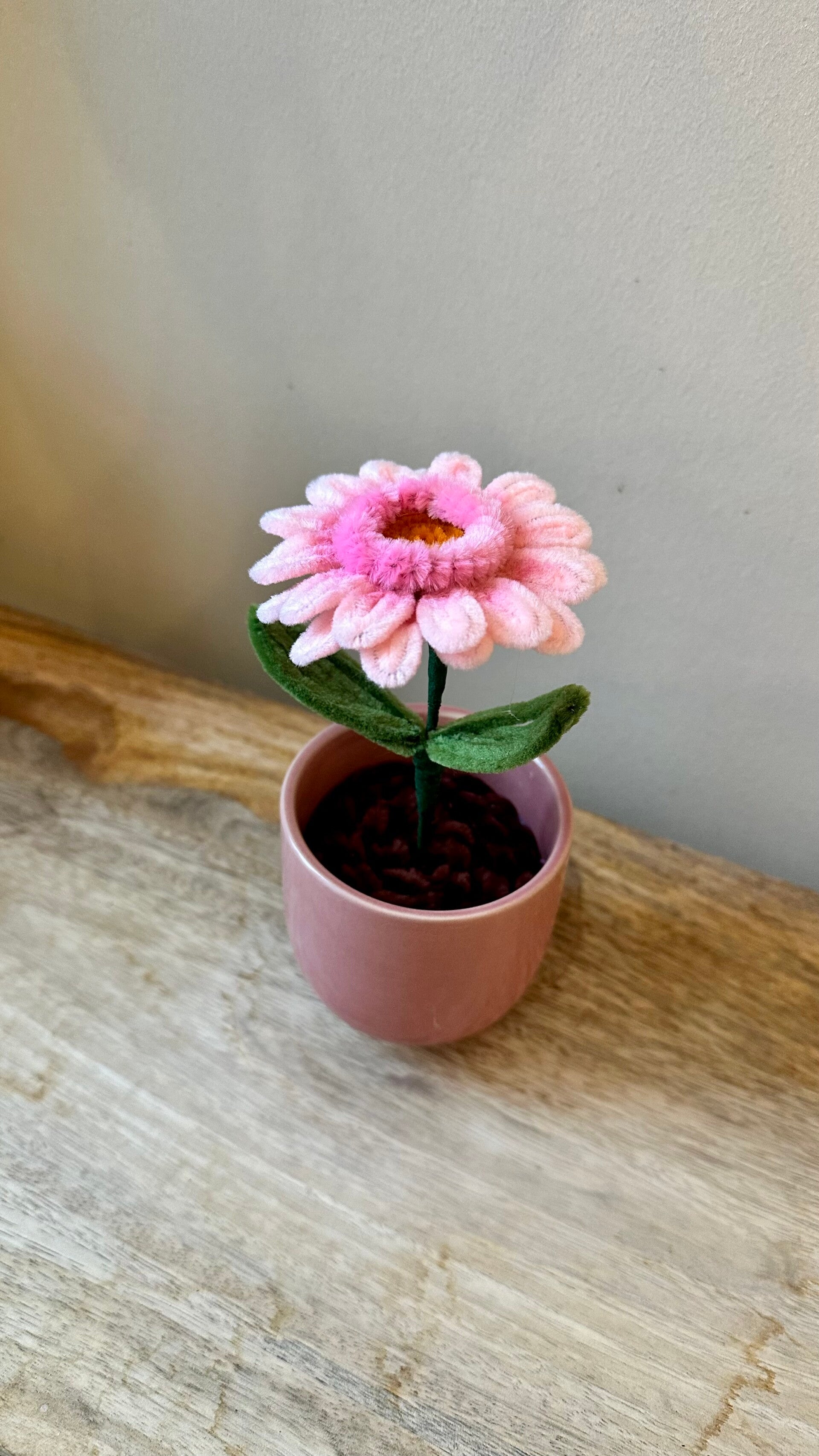 Handgemaakte gerbera (roze) in een sierlijk bloempotje.Met zorg samengesteld en volledig met de hand gemaakt voor een natuurlijke, blijvende uitstraling.