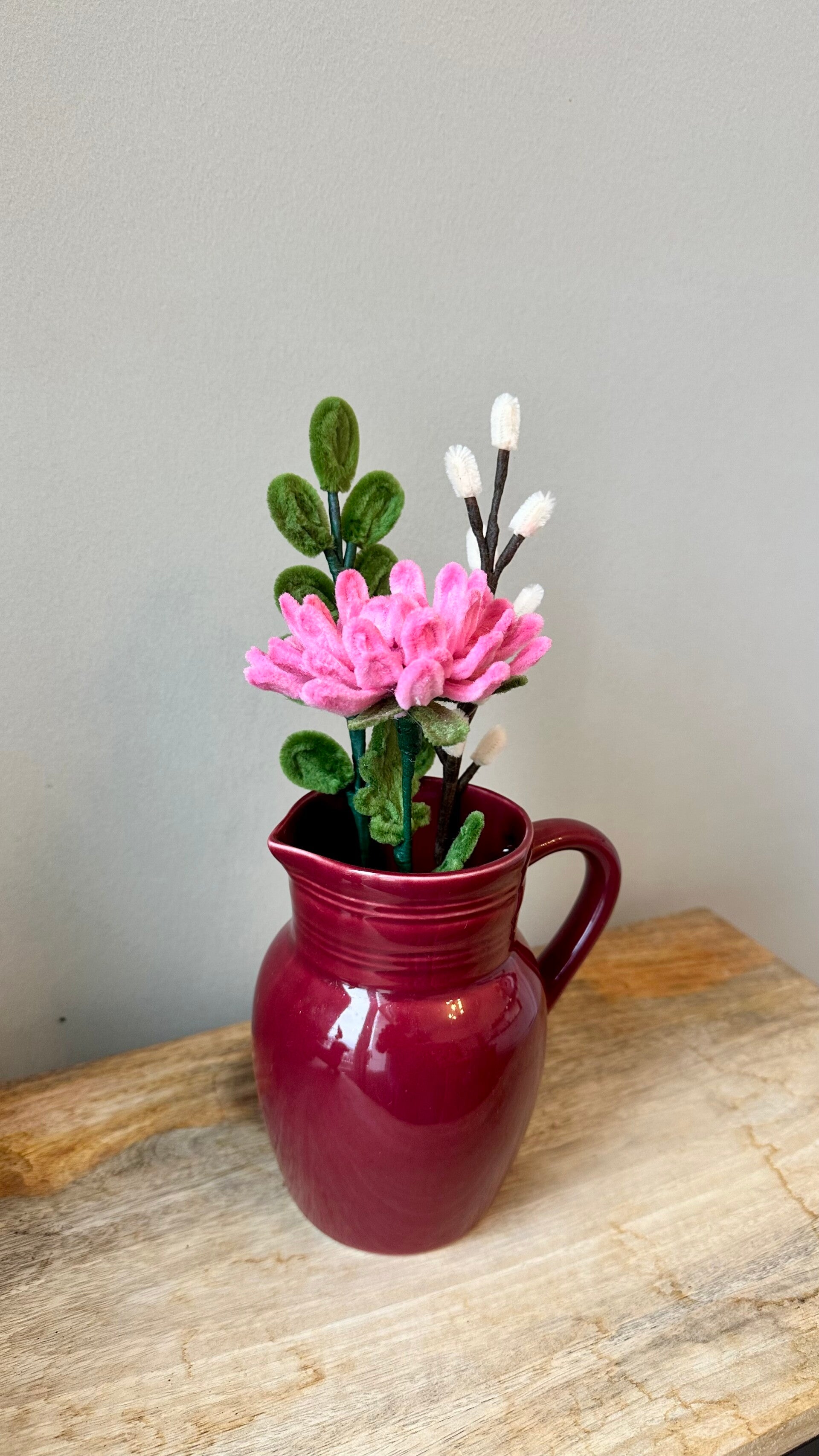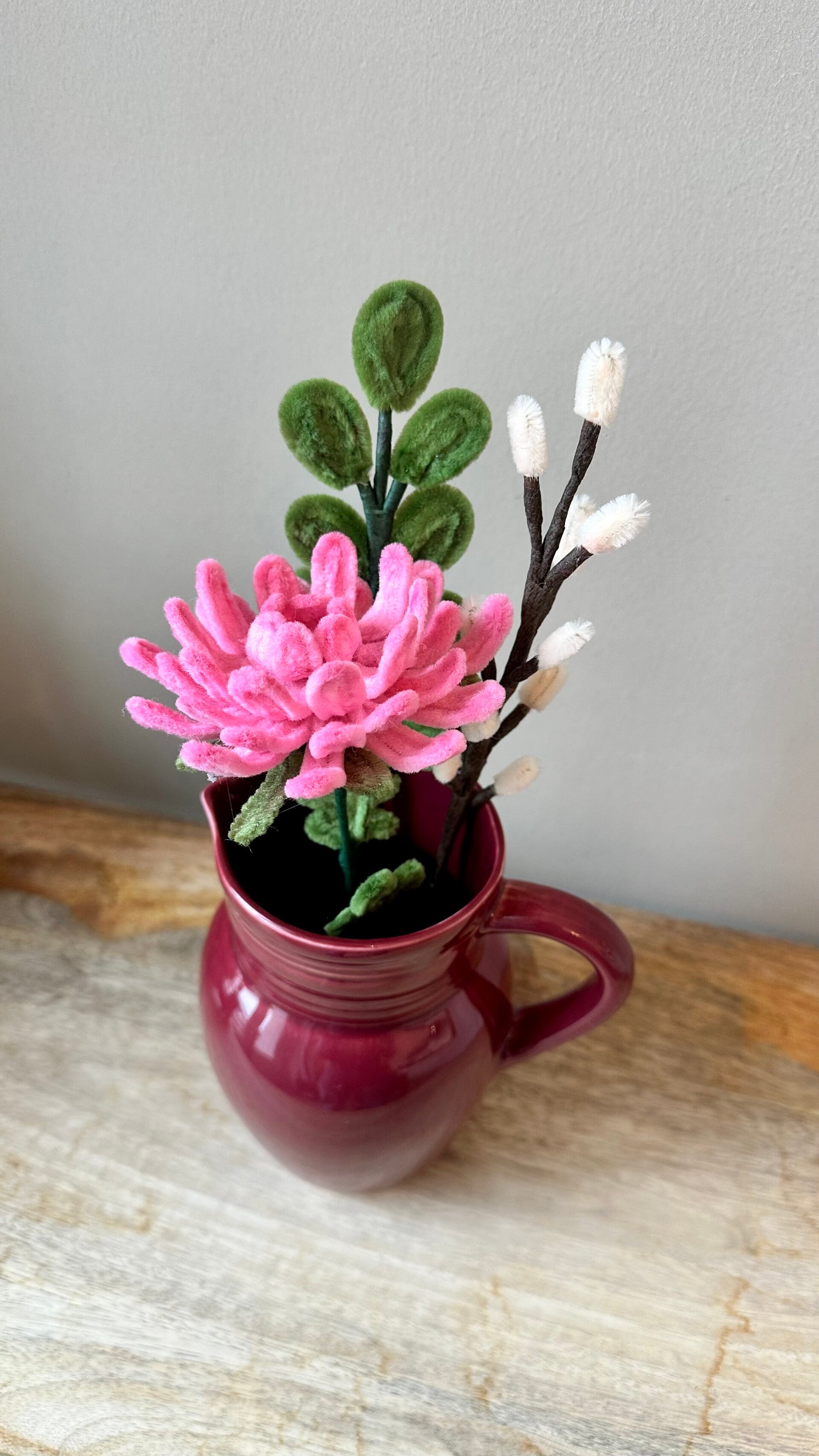 Handgemaakt chrysant (roze) arrangement in een sierlijk vaasje.