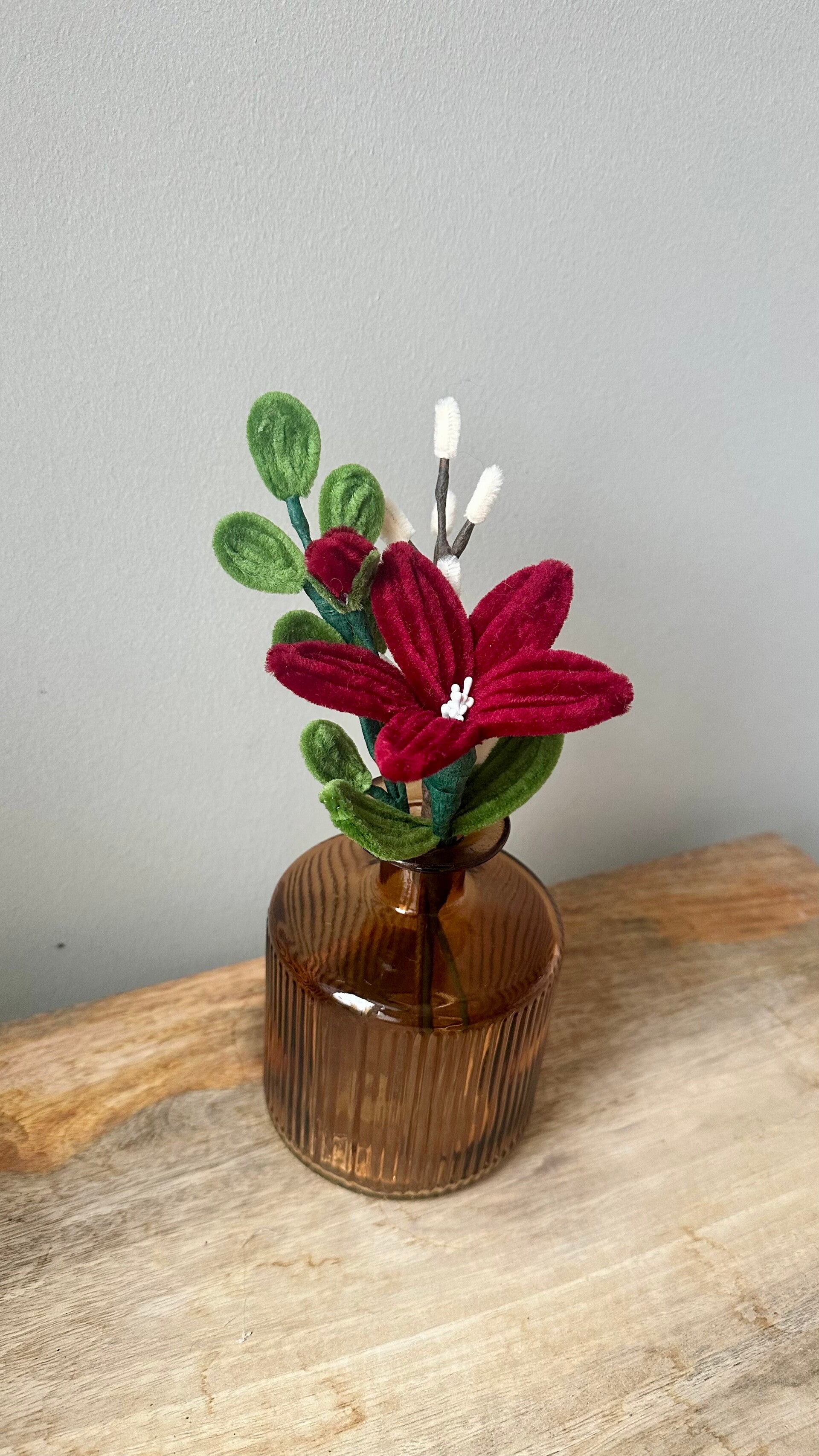 Handgemaakte lelie (donkerrood) arrangement in een sierlijk vaasje.