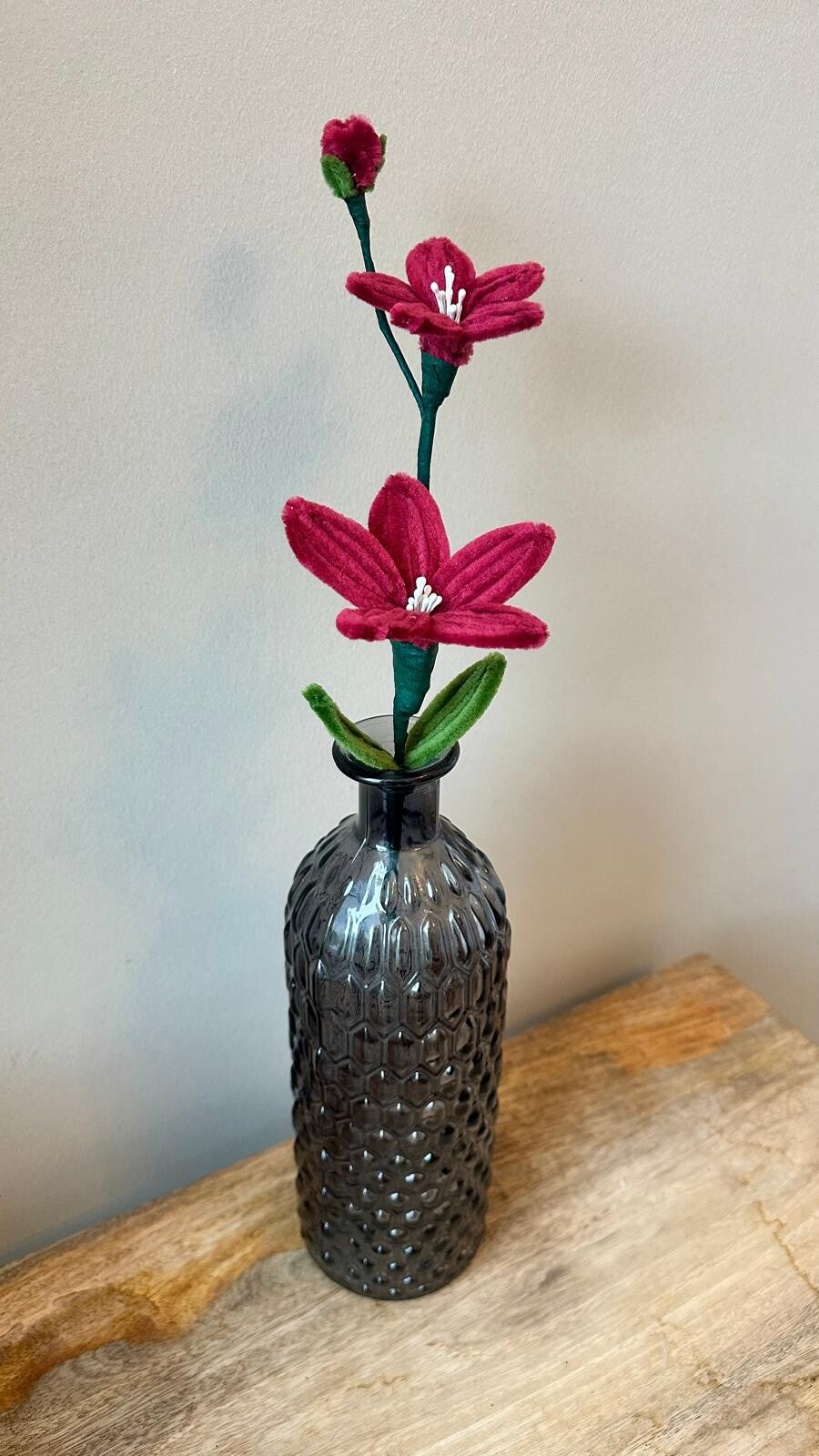 Handgemaakte lelie (bordeaux) in een sierlijk vaasje.