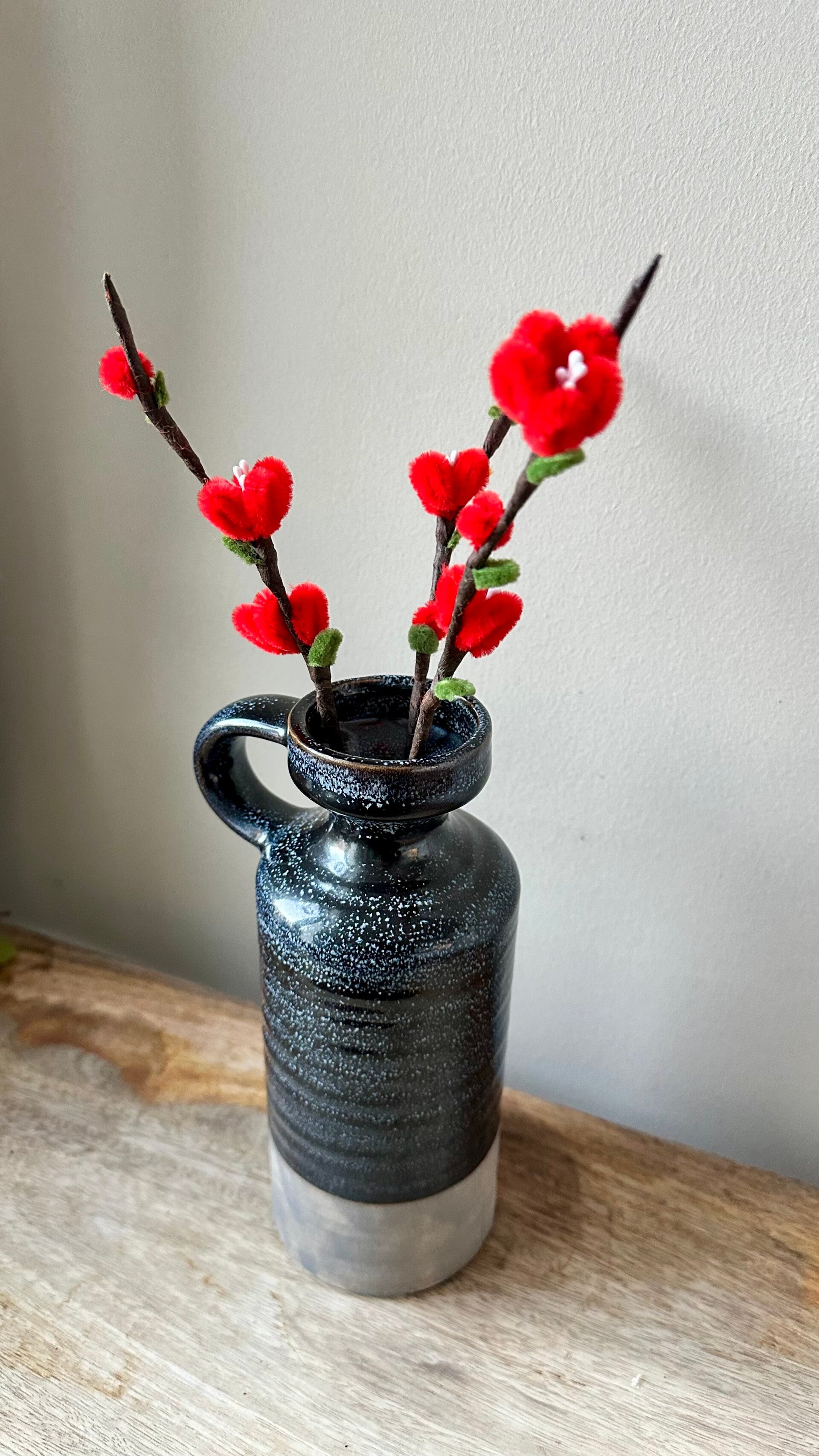 Handgemaakte rode bloesem in een sierlijk vaasje.
